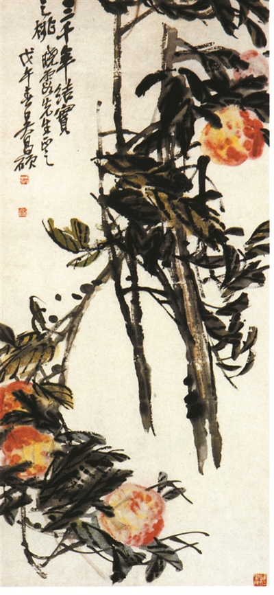 吳昌碩,原名俊,俊傾,字昌碩,別號(hào)缶廬、大龍、苦鐵等,浙江安吉人?!霸?shī)、書(shū)、畫(huà)、印”四絕的一代宗師,與任伯年、趙之謙、虛谷齊名為“清末海派四大家”?!度杲Y(jié)實(shí)之桃》,作于1918年。這幅作品運(yùn)用篆書(shū)筆法,疏闊縱放,雄渾有力,顯現(xiàn)出磅礴而茁壯的氣勢(shì),筆力強(qiáng)悍,是吳昌碩大器晚成的絕佳寫(xiě)照。