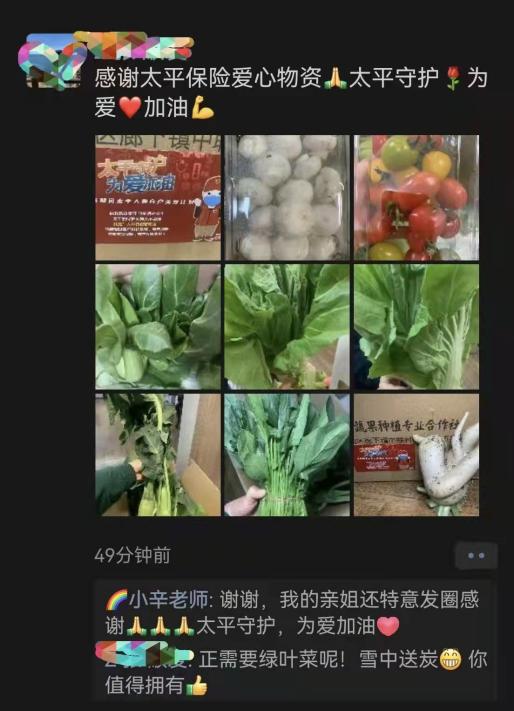為積極應(yīng)對疫情,太平人壽上海分公司迅速反應(yīng),推出“太平守滬為愛加油”客戶關(guān)愛計劃。公司與滬上知名果蔬種植基地合作,將新鮮采摘的蔬果,由持有48小時內(nèi)核酸陰性證明的太平保險代理人,為客戶朋友直線送達。
