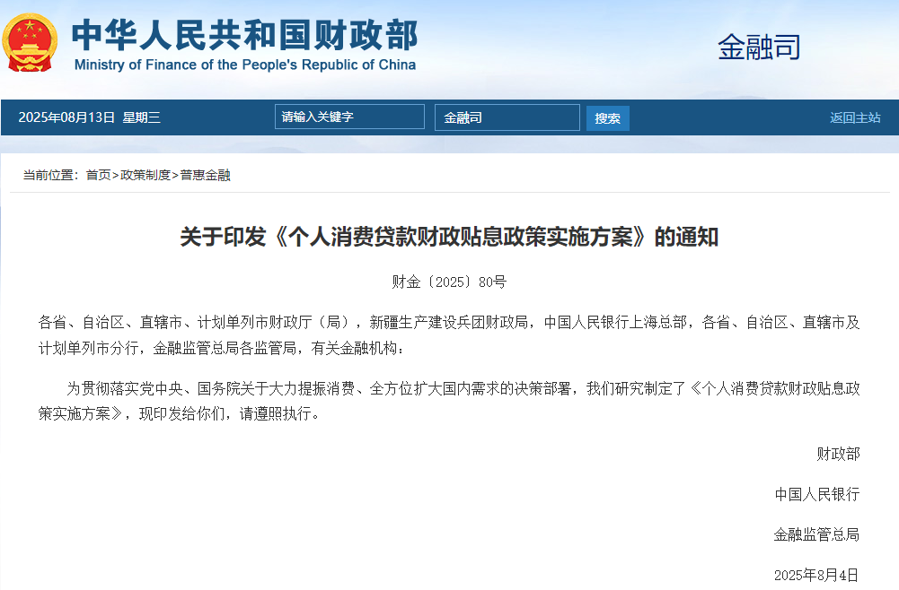 深圳新聞網(wǎng)2025年8月13日訊(記者 湯莎)近日,財(cái)政部、中國人民銀行、金融監(jiān)管總局印發(fā)《個(gè)人消費(fèi)貸款財(cái)政貼息政策實(shí)施方案》(以下簡稱方案),中央及省級財(cái)政將對符合條件的個(gè)人消費(fèi)貸款實(shí)施貼息。