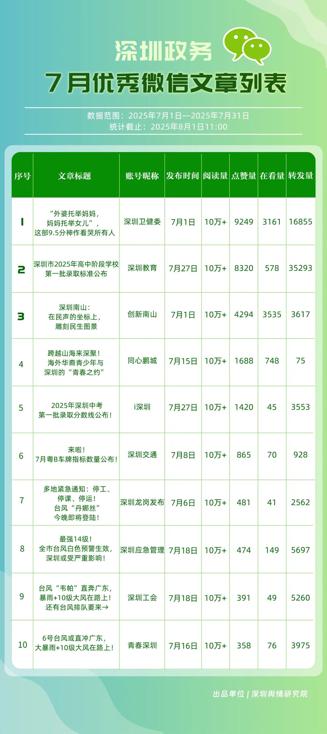 7月,30個(gè)政務(wù)微信公眾號(hào)入選“深圳優(yōu)秀政務(wù)微信公眾號(hào)”榜單,其中包括“深圳衛(wèi)健委”“深圳龍崗發(fā)布”“幸福福田”“創(chuàng)新南山”“i深圳”“深圳教育”“青春深圳”“深圳工會(huì)”“深圳光明”“濱海寶安”等。7月,“深圳衛(wèi)健委”內(nèi)容專業(yè)性與傳播力優(yōu)勢(shì)穩(wěn)固,整體表現(xiàn)保持較高水平,位于榜首;“深圳龍崗發(fā)布”聚焦民生服務(wù)與區(qū)域活動(dòng)宣傳,實(shí)現(xiàn)傳播效果提升,位居第二;“幸福福田”表現(xiàn)同樣不俗,排名第三。“創(chuàng)新南山”“深圳教育”“深圳工會(huì)”等也積極發(fā)布高質(zhì)量信息與服務(wù)內(nèi)容,能夠較好平衡內(nèi)容“質(zhì)”與“量”,排名有所提升。上榜微信公眾號(hào)依托特色優(yōu)勢(shì)深耕內(nèi)容創(chuàng)作,將優(yōu)質(zhì)內(nèi)容作為核心支撐,成為政務(wù)傳播領(lǐng)域的優(yōu)秀典范。