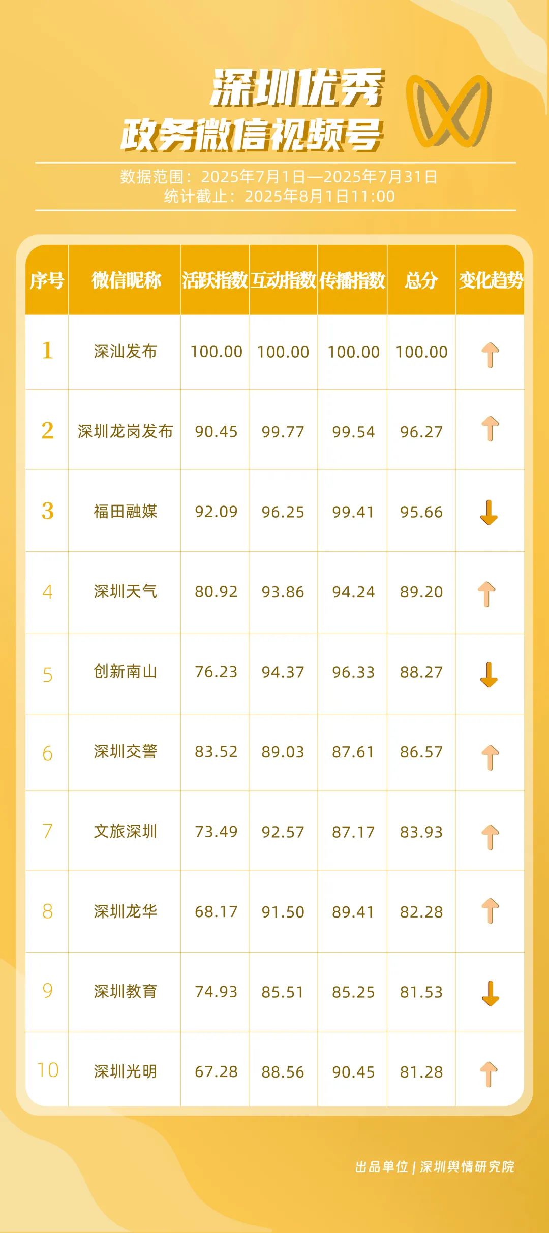 7月,“深圳天氣”“DOU愛(ài)龍華”“深圳魅力福田”“深汕發(fā)布”“掌上龍崗”“創(chuàng)新南山”“深圳交警”“文旅深圳”“深圳衛(wèi)健委”“深圳普法”共10個(gè)政務(wù)抖音號(hào)獲得“優(yōu)秀政務(wù)抖音號(hào)”稱號(hào)。其中,“深圳天氣”互動(dòng)指標(biāo)獲滿分,憑借氣象與趣味相結(jié)合的創(chuàng)新科普形式,領(lǐng)跑優(yōu)秀政務(wù)抖音號(hào);“DOU愛(ài)龍華”“深圳魅力福田”分別位列第二、三名,通過(guò)聚焦網(wǎng)絡(luò)熱點(diǎn)、挖掘創(chuàng)意內(nèi)容,不斷提升傳播效能,展現(xiàn)出強(qiáng)大的政務(wù)新媒體影響力;“深汕發(fā)布”“掌上龍崗”“創(chuàng)新南山”等賬號(hào)緊隨其后,上榜的優(yōu)質(zhì)政務(wù)抖音號(hào)用短視頻語(yǔ)言強(qiáng)化傳播效果,展現(xiàn)了鮮明的賬號(hào)特色和風(fēng)采。