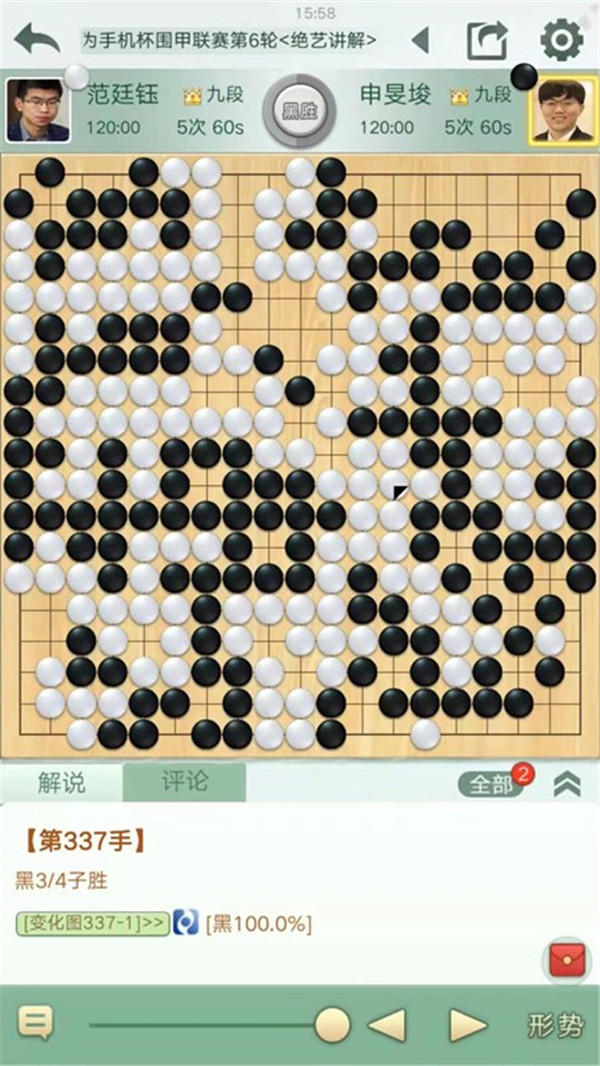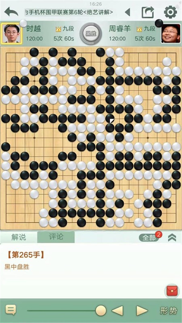 四臺(tái)時(shí)越執(zhí)白對(duì)陣世界冠軍周睿羊。中盤白棋侵消黑棋左上大模樣,黑棋付出很大代價(jià)強(qiáng)殺形成打劫。白棋劫爭(zhēng)中不夠細(xì)膩沒(méi)有擴(kuò)大戰(zhàn)果而是聯(lián)絡(luò)成活,局面白稍有利。之后白棋左下連續(xù)下出緩手后局面接近。右下角黑棋二路夾試白應(yīng)手時(shí)白棋嚴(yán)重失誤,被黑棋奪走角地后局勢(shì)逆轉(zhuǎn)。