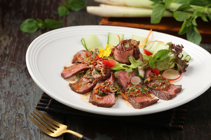 牛肉被貼心地切成小塊,以辣椒醬、檸檬汁、魚露、香茅、蒜頭、蠔油等調味料先醃漬入味,煎至表皮微焦後再烘烤,微透著肉粉色就知道多鮮嫩又不失咬勁,微辣帶酸的滋味,令人印象深刻。