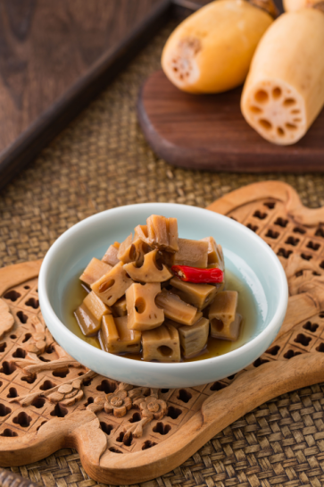 高壓鍋將藕蒸熟,脆軟適中,用醋、糖、醬油、辣椒調(diào)味,咸鮮酸甜,微辣,是一道開胃下酒的小菜。