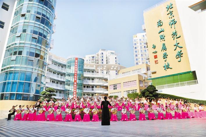 發(fā)掘民族器樂個(gè)性,傳承優(yōu)秀文化精髓,既是藝術(shù)工作者的一種情懷,更是教育工作者的一種使命。北京師范大學(xué)南山附屬學(xué)校小學(xué)部秉承實(shí)施“個(gè)性化素質(zhì)教育”的辦學(xué)理念,在“校園七色花,朵朵都精彩”的學(xué)生發(fā)展觀指引下,于2013年10月組建了深圳市第一支少兒阮樂團(tuán),樂手平均年齡10歲,是國(guó)內(nèi)平均年齡最小的阮樂團(tuán)。經(jīng)過數(shù)年的努力,樂團(tuán)發(fā)展到百人規(guī)模,頻頻登上國(guó)內(nèi)外高規(guī)格平臺(tái)演出,成為享譽(yù)國(guó)內(nèi)外的少兒阮樂團(tuán)。在第二批全國(guó)中小學(xué)中華優(yōu)秀傳統(tǒng)文化藝術(shù)傳承校中,北京師范大學(xué)南山附屬學(xué)校實(shí)力上榜。