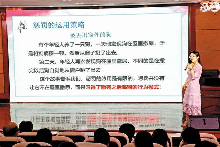 講座中,齊玲老師介紹三體腦精神,然后圍繞“馬斯洛需求層次理論”五個板塊結(jié)合實例進(jìn)行具體講解:一、生理需求;二、安全需要,根據(jù)羅森塔爾效應(yīng),指出教師應(yīng)以積極發(fā)展的眼光看待孩子;三、社交需要;四、尊重的需要,從內(nèi)部認(rèn)可的鼓勵到外部認(rèn)可的鼓勵會導(dǎo)致“德西效應(yīng)”;五、自我實現(xiàn)需求。期間,她通過各項案例,以常見的心理問題為例,層層推進(jìn),逐步告訴老師們面對此類問題的解決辦法,令老師們受益匪淺。
