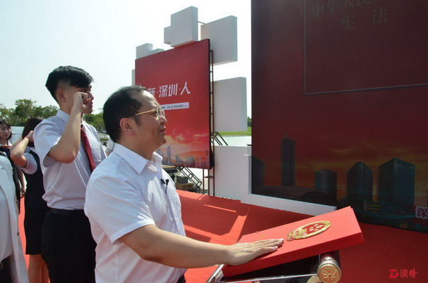 9月21日上午,深圳市普法辦、深圳市司法局和深圳廣電集團(tuán)在深圳人才公園潮汐廣場(chǎng)舉辦2018年“新深圳人”向《中華人民共和國(guó)憲法》宣誓儀式,深圳市政協(xié)副主席黎軍監(jiān)誓,深圳市司法局局長(zhǎng)蔣溪林帶領(lǐng)20名“新深圳人”代表面對(duì)憲法莊嚴(yán)宣誓。市民向憲法宣誓,在全國(guó)尚屬首次。