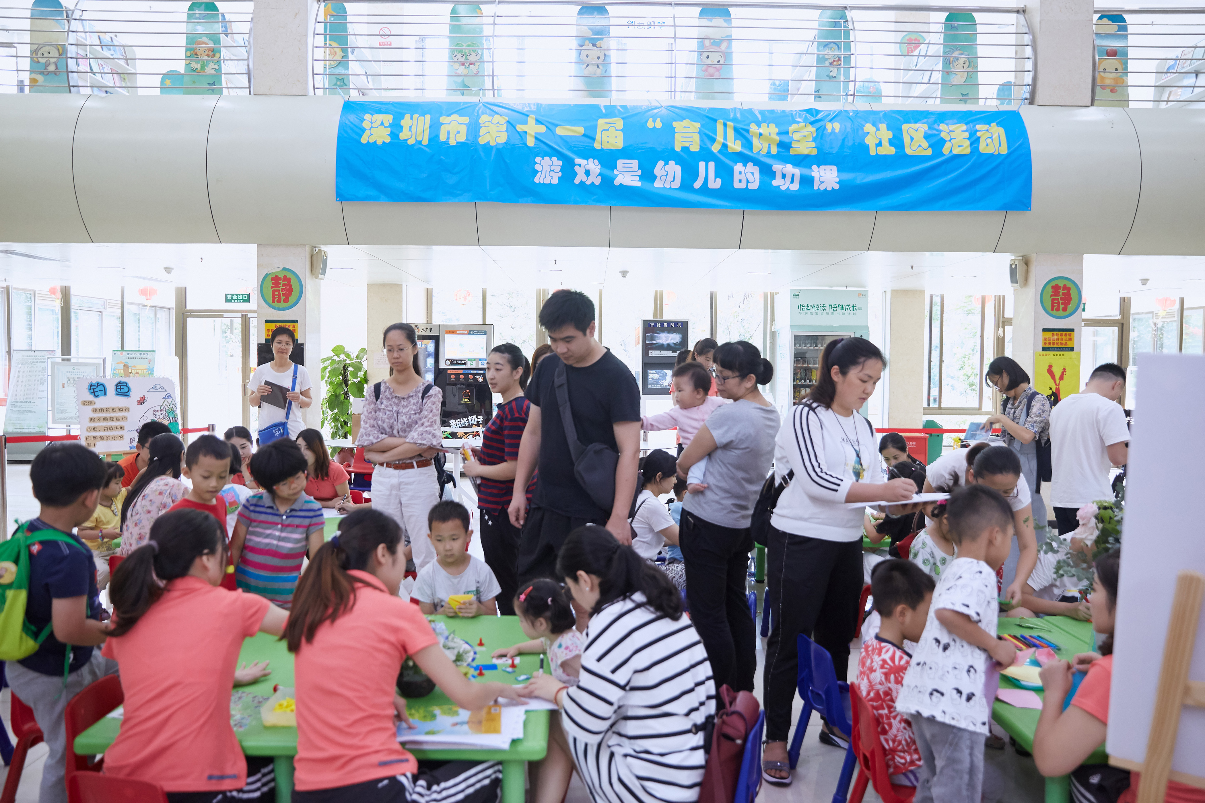 當(dāng)天就有兩場活動分別在深圳市少兒圖書館和深圳中心書城同時舉行。少兒圖書館里,來自深圳市濱苑幼兒園的老師們圍繞“游戲是孩子的功課”話題,開展現(xiàn)場咨詢和游戲活動。針對“父母如何倡導(dǎo)親子游戲、把游戲引進家庭并促進幼兒的學(xué)習(xí)與發(fā)展,形成家庭中寓教于游戲”等話題與前來咨詢的家長展開了互動和分享。幫助家長了解游戲?qū)τ變撼砷L的意義,指導(dǎo)如何在家庭中創(chuàng)設(shè)游戲環(huán)境、提供游戲材料以及和孩子一起玩游戲的小方法和小策略。