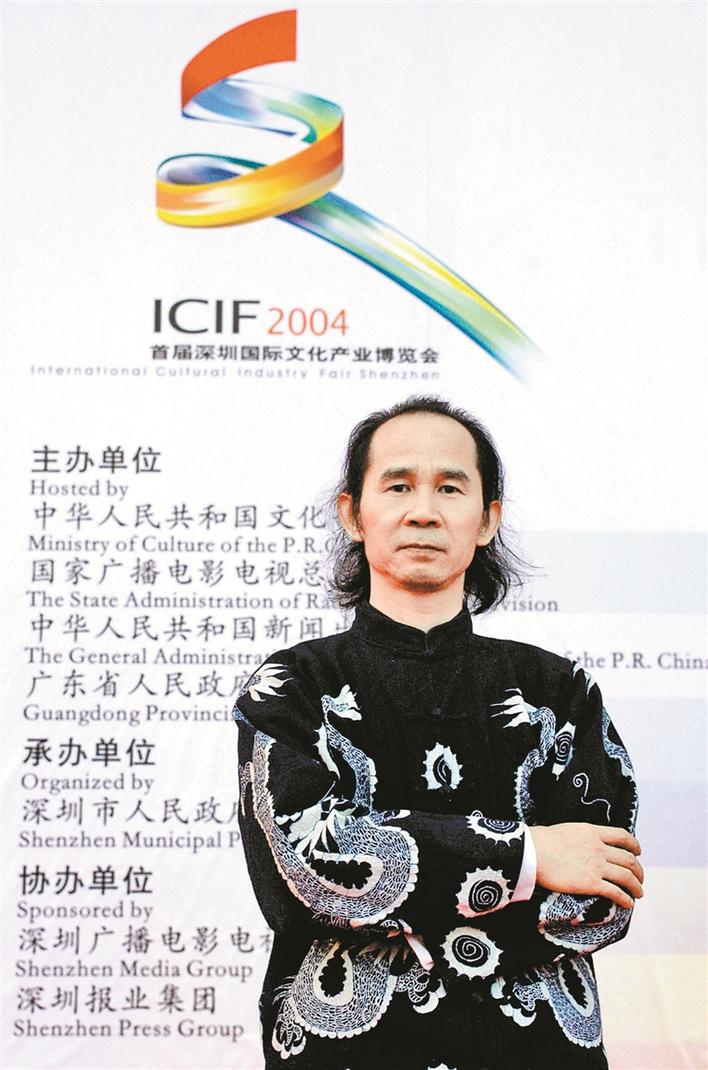 ▲2004年,莊玉君和他設計的文博會會徽“七彩文”。