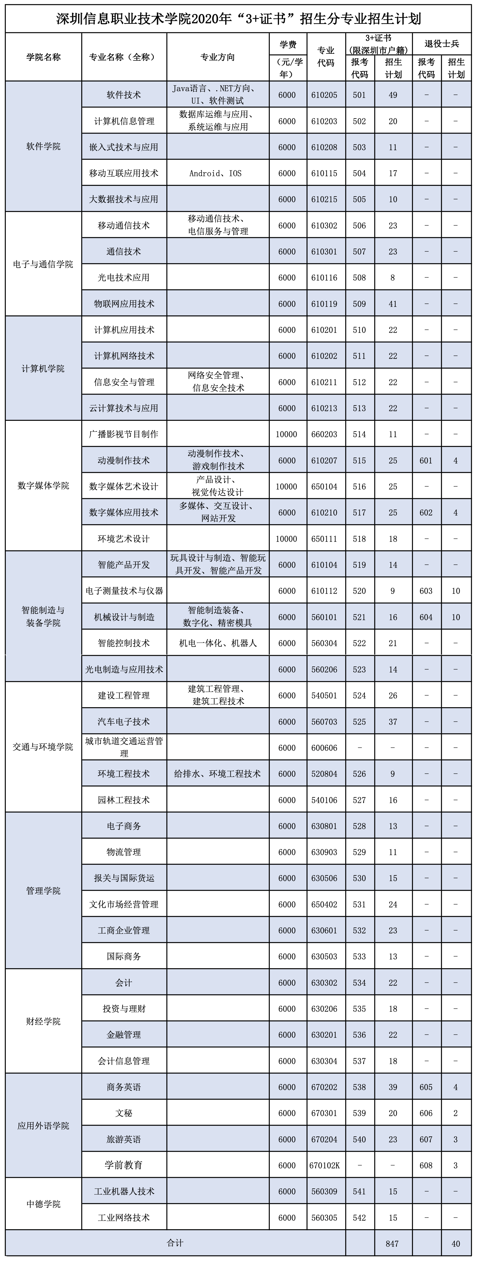 見圳客戶端·深圳新聞網(wǎng)2020年4月7日訊(見圳客戶端、深圳新聞網(wǎng)記者金洪竹)近日,記者從深圳信息職業(yè)技術(shù)學(xué)院(以下簡稱“深圳信息學(xué)院”)獲悉,該校2020年春季高考招生報名于4月7日正式啟動,將“依學(xué)考成績錄取”面向省內(nèi)普通高中畢業(yè)生計(jì)劃招生2400人,其中文科計(jì)劃招生758人,理科計(jì)劃招生1514人,美術(shù)計(jì)劃招生128人;“3+證書考試”計(jì)劃招生887人,其中面向深圳市戶籍中職生計(jì)劃招生847人,面向廣東省內(nèi)退役士兵計(jì)劃招生40人。