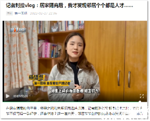 住在華瑞大廈A座封控區(qū)的第一現(xiàn)場(chǎng)記者楊語(yǔ)然,每天拍攝視頻記錄封控生活。在她的鏡頭下,封控區(qū)防疫工作有條不紊,民生服務(wù)暖心到位,鄰里之間抱團(tuán)取暖、相互打氣。她表示,因?yàn)檫@段“特殊的”居家隔離時(shí)光,鄰里之間的關(guān)系反而迅速升溫,每天在微信群里互動(dòng),才知道住在一起的鄰居們那么多才多藝。