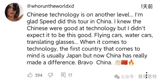 (中國(guó)的科技水平又上了一個(gè)臺(tái)階......我很高興Speed在中國(guó)舉辦了這次巡演。我知道中國(guó)人擅長(zhǎng)科技,但我沒(méi)想到會(huì)這么好。飛行汽車(chē)、水上汽車(chē)、翻譯眼鏡......說(shuō)到科技,首先想到的國(guó)家通常是日本,但現(xiàn)在中國(guó)真的做出了改變。中國(guó)萬(wàn)歲?。?/p>