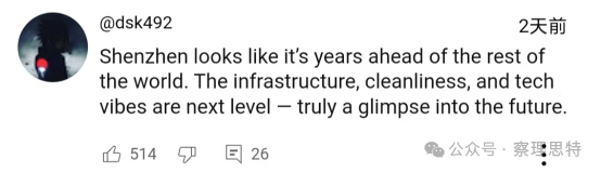 (“深圳看起來(lái)比世界其他地方領(lǐng)先好幾年。基礎(chǔ)設(shè)施、清潔度和科技氛圍都是一個(gè)新的水平——真正讓人看到了未來(lái)。”)