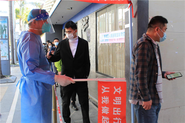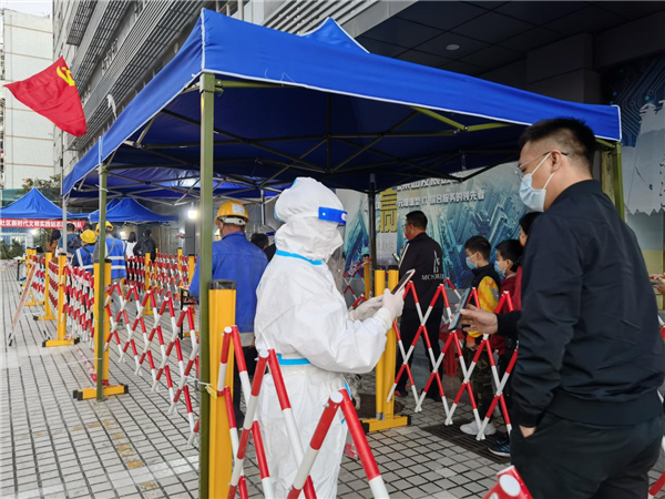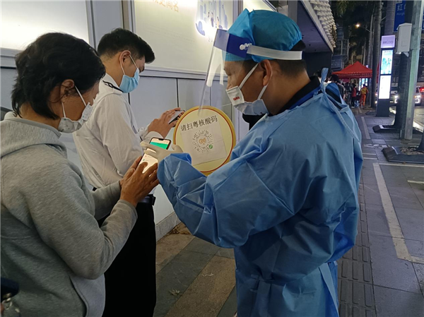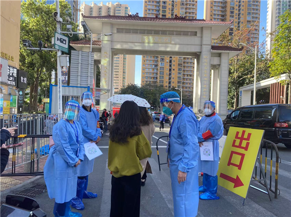 游國(guó)良剛剛調(diào)到位于羅湖區(qū)桂園街道老圍社區(qū)做保安員,沒(méi)想到才過(guò)了幾天,他成為了一名志愿者穿上了防護(hù)服,轉(zhuǎn)戰(zhàn)在卡口和核酸檢測(cè)點(diǎn)兩個(gè)防疫戰(zhàn)場(chǎng),查驗(yàn)場(chǎng)所碼和粵核酸碼。他感慨道,“這是我人生做的第一件有意義的事,雖然累,衣服都濕透了,但一點(diǎn)都沒(méi)感覺(jué)出來(lái),為人民服務(wù)就是爽!”