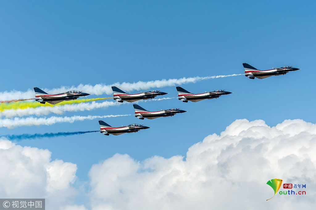 圖三:2018年11月6日,廣東珠海航展上,八一飛行表演隊駕駛著殲-10A飛機劃過天空。