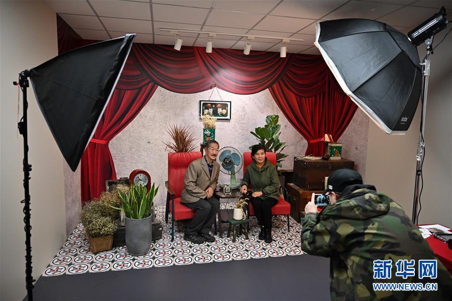 11月15日,兩名參觀者在“時(shí)光博物館”里的年代照相館拍照留念。