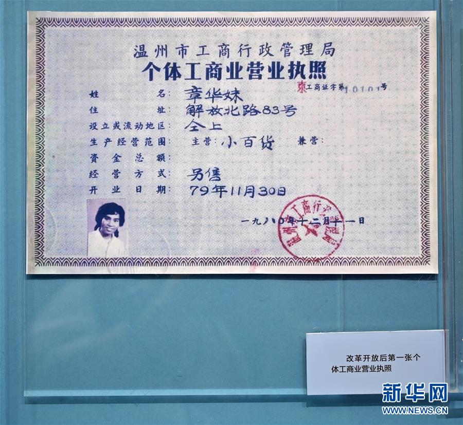 這是在“歷史巨變”展區(qū)拍攝的改革開放后第一張個(gè)體工商業(yè)營業(yè)執(zhí)照(11月15日攝)。