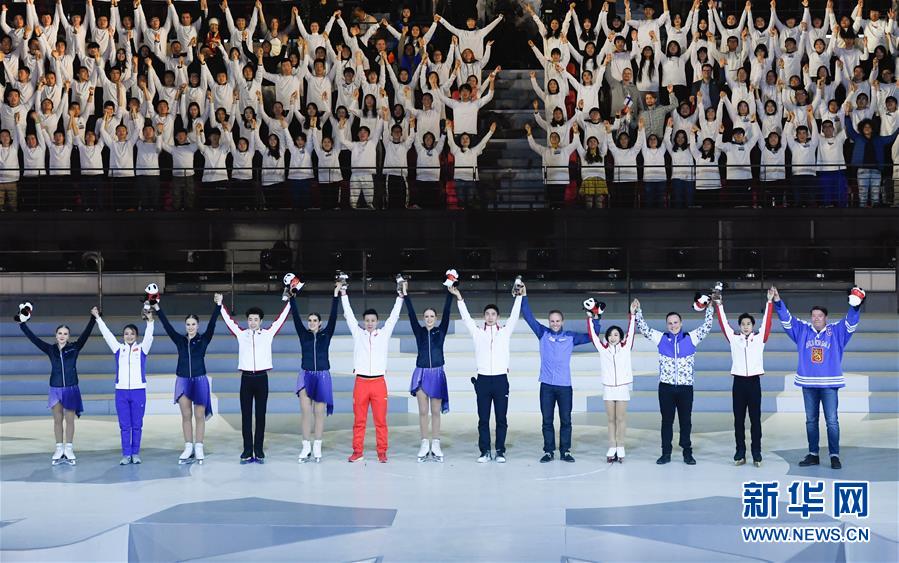 1月15日,中芬運(yùn)動(dòng)員代表攜手向觀眾致意。 當(dāng)日,“2019中芬冬季運(yùn)動(dòng)年”開幕式在北京首鋼冰球館舉行。 新華社記者申宏攝