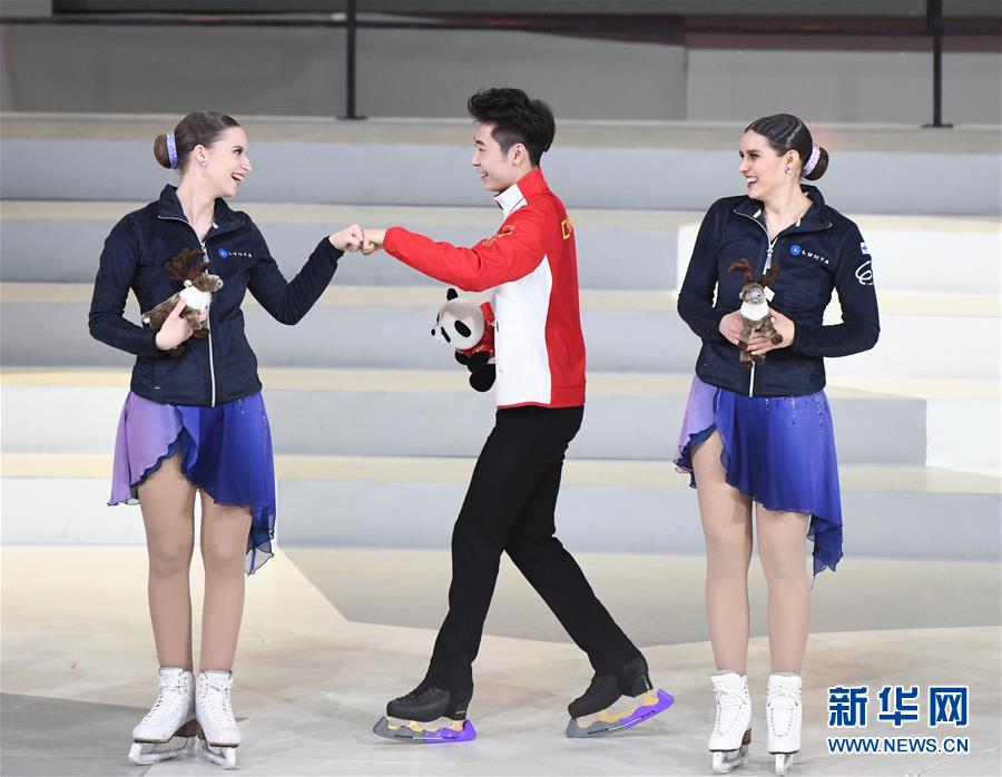 1月15日,中國(guó)花樣滑冰選手金博洋(中)與芬蘭運(yùn)動(dòng)員交流。 當(dāng)日,“2019中芬冬季運(yùn)動(dòng)年”開幕式在北京首鋼冰球館舉行。 新華社記者申宏攝