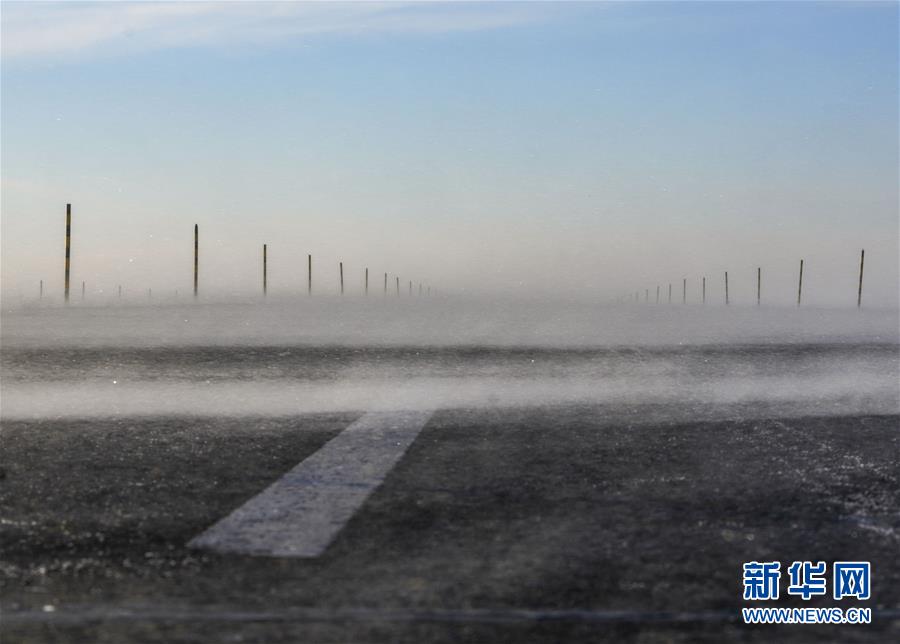 在新疆瑪依塔斯風區(qū)內(nèi),公路上大風卷起細雪飄散開來(1月13日攝)。 瑪依塔斯風區(qū)位于新疆西北部額敏縣境內(nèi)。這里東西風交替頻繁,一年大風天數(shù)超過150天,是世界上罕見的暴風雪災害地段。駐守在這里的新疆塔城公路管理局額敏分局瑪依塔斯應急保障基地,近年來連續(xù)裝備拋雪機等冰雪搶險救災裝備,有力地保障了這條道路的交通安全。 新華社記者趙戈攝