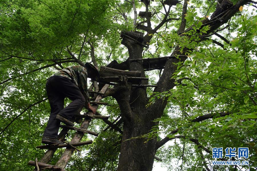 5月10日,在甘肅省隴南市徽縣大河店鎮(zhèn)硬灣村,蜂農(nóng)劉輝林準(zhǔn)備查看放在樹上的蜂箱情況。 甘肅省隴南市徽縣大河店鎮(zhèn)硬灣村位于秦巴山區(qū)深處,2017年,在當(dāng)?shù)卣姆龀窒?,龍崖老巢蜜養(yǎng)殖農(nóng)民專業(yè)合作社成立,蜂農(nóng)們將傳統(tǒng)養(yǎng)蜂技藝和現(xiàn)代加工方式相結(jié)合,并通過電商等渠道打開銷路,有效帶動了當(dāng)?shù)刎毨Т迕衩撠氈赂弧D壳罢麄€合作社共有蜂箱2000余個,每箱每年可帶來三四千元的收入。 新華社記者 馬寧 攝