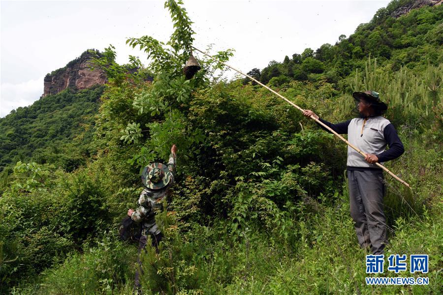 5月10日,在甘肅省隴南市徽縣大河店鎮(zhèn)硬灣村,蜂農(nóng)周仲頤(右)在收蜂。 甘肅省隴南市徽縣大河店鎮(zhèn)硬灣村位于秦巴山區(qū)深處,2017年,在當(dāng)?shù)卣姆龀窒拢堁吕铣裁垧B(yǎng)殖農(nóng)民專(zhuān)業(yè)合作社成立,蜂農(nóng)們將傳統(tǒng)養(yǎng)蜂技藝和現(xiàn)代加工方式相結(jié)合,并通過(guò)電商等渠道打開(kāi)銷(xiāo)路,有效帶動(dòng)了當(dāng)?shù)刎毨Т迕衩撠氈赂?。目前整個(gè)合作社共有蜂箱2000余個(gè),每箱每年可帶來(lái)三四千元的收入。 新華社記者 馬寧 攝