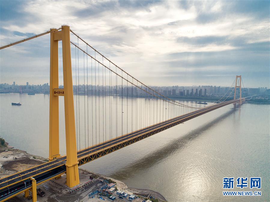 楊泗港大橋建設(shè)創(chuàng)造了多項(xiàng)世界之最:一是主橋跨度達(dá)1700米,為世界上跨度最大的雙層懸索橋;二是主橋設(shè)置雙層雙向12車(chē)道,是世界上通行能力最大的公路橋梁;三是大橋主纜設(shè)計(jì)張力6.5萬(wàn)噸,采用了世界上強(qiáng)度等級(jí)最高的主纜鋼絲;四是大橋設(shè)置機(jī)動(dòng)車(chē)道、非機(jī)動(dòng)車(chē)道、人行觀光道,集過(guò)江交通與觀光于一體,是長(zhǎng)江上功能最完備的橋梁。新華社記者熊琦攝