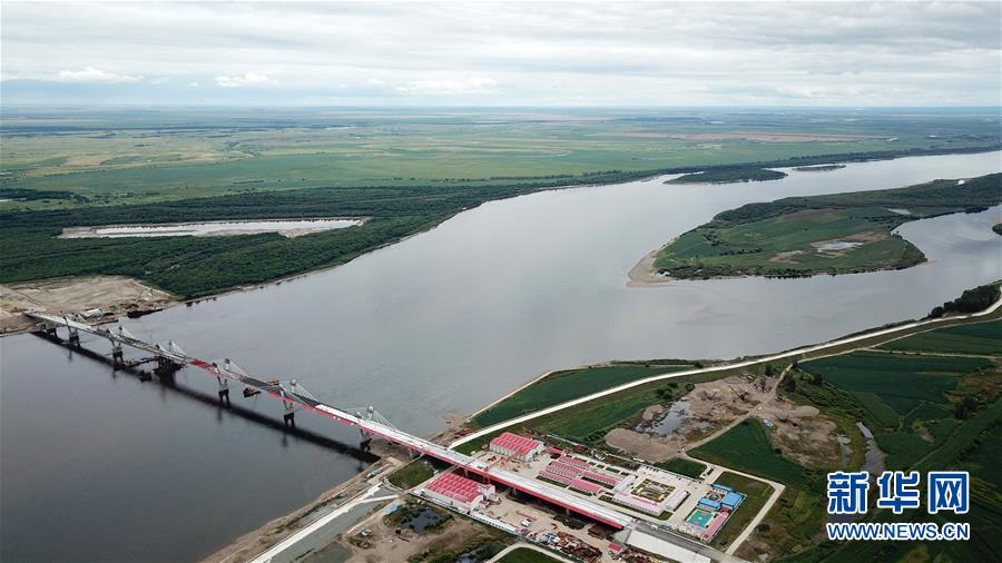 正在進行橋面鋪裝施工作業(yè)的黑河到布拉戈維申斯克黑龍江(阿穆爾河)大橋(8月19日無人機拍攝)。新華社記者王建威攝