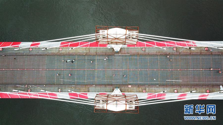 正在進(jìn)行橋面鋪裝施工作業(yè)的黑河到布拉戈維申斯克黑龍江(阿穆爾河)大橋(8月19日無人機(jī)拍攝)。新華社記者王建威攝