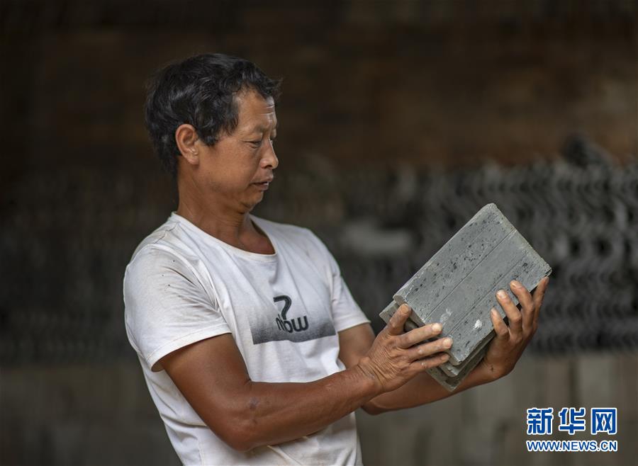 石屏縣異龍鎮(zhèn)符家營(yíng)村村支書(shū)楊松在挑選準(zhǔn)備用于修繕老屋的地磚(8月8日攝)。新華社記者江文耀攝