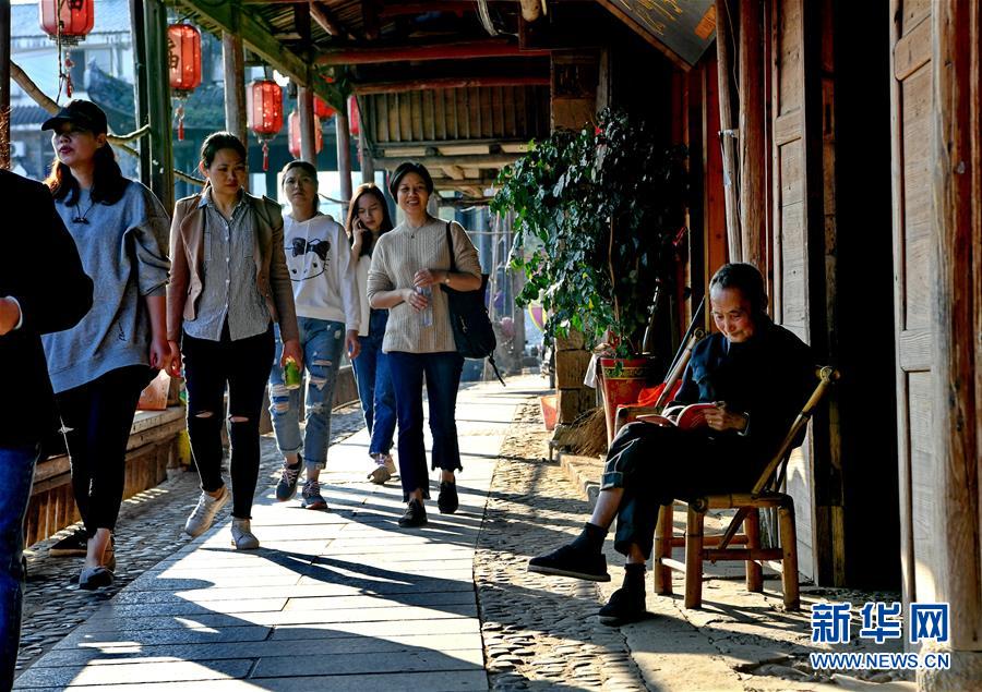 游客在武夷山下梅村游覽(11月5日攝)。福建省武夷山市下梅村是“中國歷史文化名村”,這里歷史悠久,人文薈萃,至今保存著70余幢明清時代的古民居。人工運河穿村而過,古民居、涼亭、古街等構(gòu)成了別具特色的江南水鄉(xiāng)風(fēng)景。新華社記者馬平攝