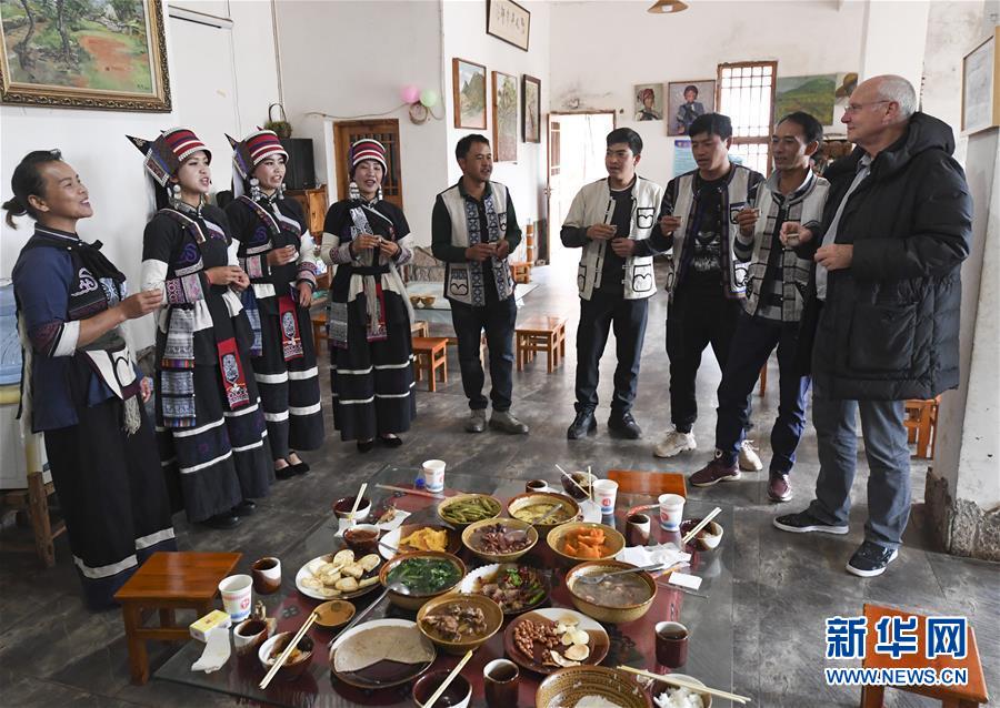 11月28日,大糯黑村村民畢興學(xué)(左五)、李學(xué)芝(左一)夫婦和工作人員們一起給外國游客(右一)祝酒。李學(xué)芝和丈夫畢興學(xué)經(jīng)營(yíng)著一家農(nóng)家樂,生意紅火。新華社記者王全超攝