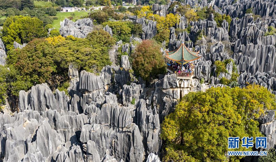 11月28日,游客在石林景區(qū)游覽(無(wú)人機(jī)拍攝)。新華社記者江文耀攝