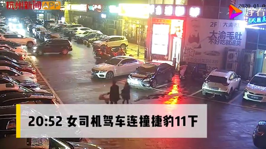 通過(guò)監(jiān)控發(fā)現(xiàn),捷豹車當(dāng)時(shí)并沒(méi)有停在停車位上,而是橫著停在停車位前的通道上,正好擋住了停在停車位里面的車輛。晚上8點(diǎn)40左右,一輛白色豐田普拉多越野車被捷豹擋住無(wú)法出去,10多分鐘后,司機(jī)通過(guò)倒車再加速十幾次撞擊捷豹,最終把車輛撞開后駛離現(xiàn)場(chǎng)。