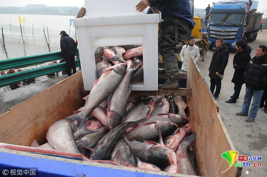 八里河冬捕與其他地方的捕魚方式不同,漁民們提前一個月的時間駕駛小船,自東向西驅(qū)逐魚群,漸漸地會把近兩萬畝水面的魚群都聚攏到碼頭附近一百多畝用圍網(wǎng)柵起來的區(qū)域。據(jù)當(dāng)?shù)貪O場負(fù)責(zé)人介紹“為了賣出好價格,今年與往年一樣,先根據(jù)市場行情確定底價,然后通過招投標(biāo)方式確定銷售商?!苯衲辏瑸榱宋嗟娜藗儊戆死锖訁⑴c冬捕活動,八里河漁場在活動當(dāng)天會拿出3萬斤鮮魚供市民選購。