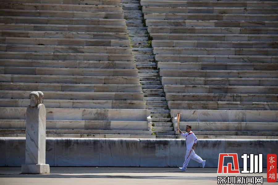 3月19日,希臘藝術體操運動員埃萊夫塞里奧斯·彼得羅尼亞斯手持圣火火炬跑入體育場。