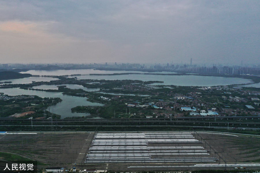 2020年4月6日,武漢動車段高鐵動車組整裝待發(fā)(無人機(jī)照片)。