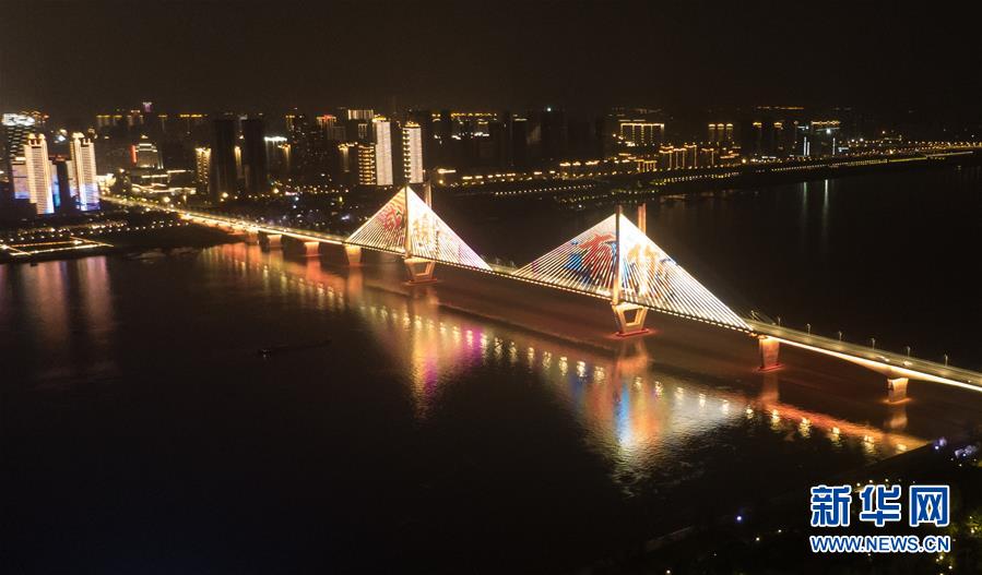 4月8日零時起,武漢市正式解除離漢離鄂通道管控措施,全市景觀照明開啟(無人機照片)。新華社記者程敏攝