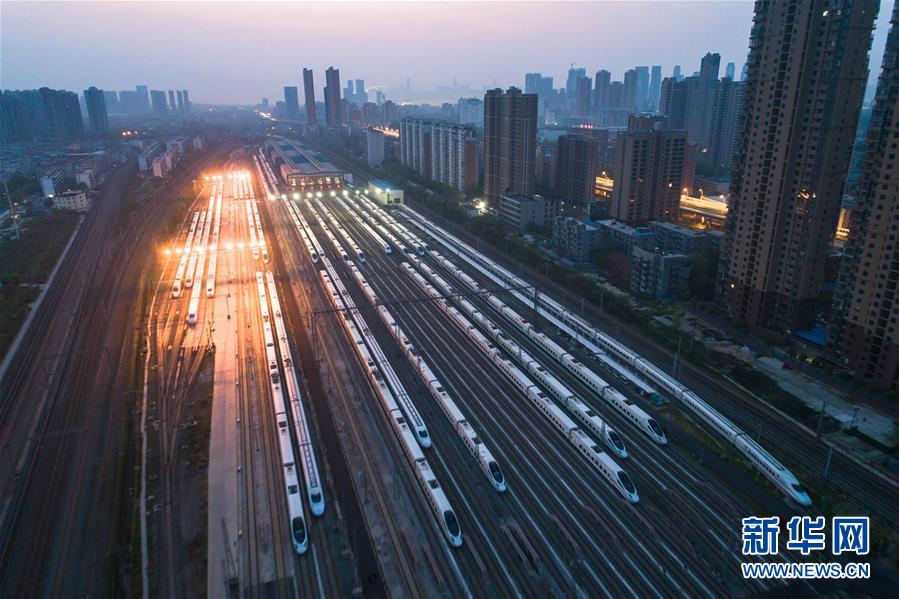 4月8日,在武漢動車段,列車??吭诖孳嚲€上準備投入運行(無人機照片)。新華社記者肖藝九攝