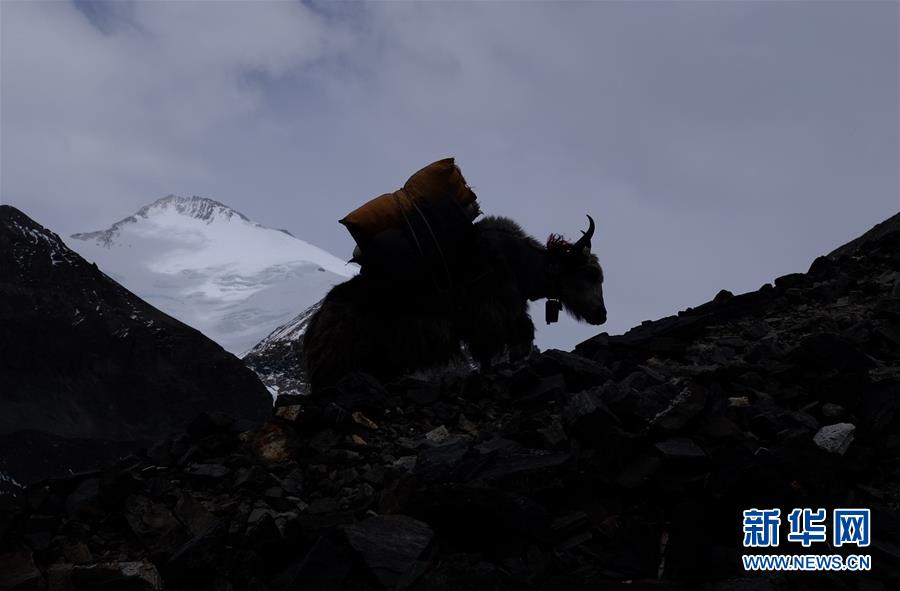 牦牛運(yùn)輸隊(duì)向海拔5800米的過渡營地運(yùn)輸物資(5月19日攝)。新華社記者晉美多吉攝