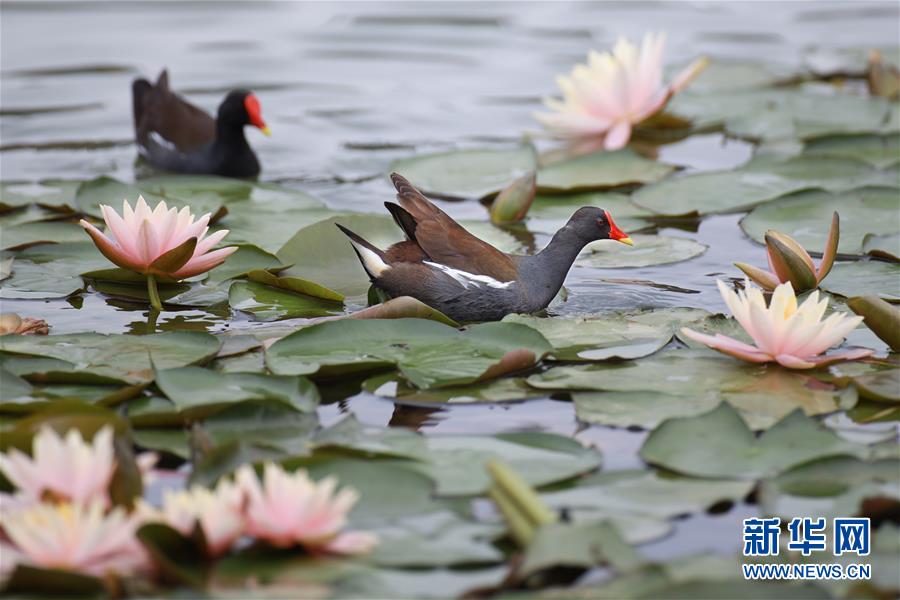 5月22日,兩只紅嘴水雞在蓮葉間游弋。近日,貴陽(yáng)市觀山湖公園內(nèi)大片盛開的蓮花吸引了不少水鳥在其間嬉戲覓食。新華社記者劉續(xù)攝