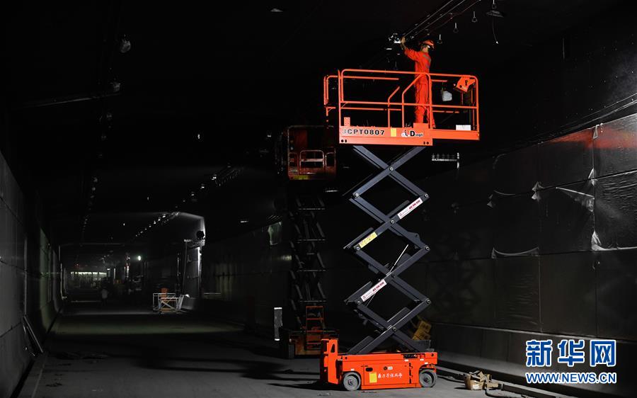 5月23日,工人在海口文明東越江通道項目隧道內(nèi)安裝照明設(shè)備。新華社記者楊冠宇攝