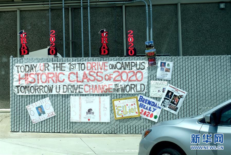 這是5月22日在美國加州北部圣馬特奧縣伯靈格姆高中拍攝的歡迎畢業(yè)生的海報。新華社記者吳曉凌攝