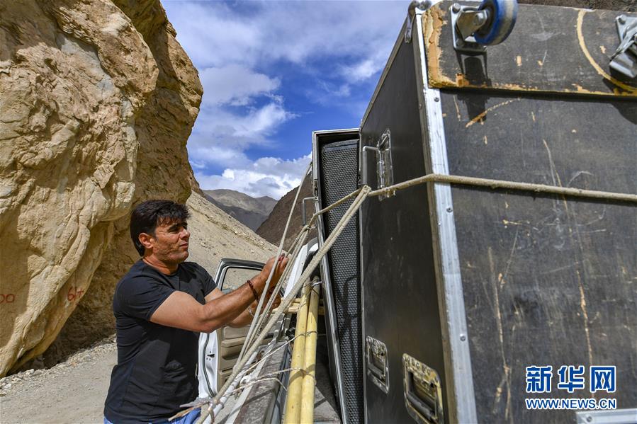 去往達布達爾鄉(xiāng)熱斯喀木村途中,塔縣文工團演員拜合提亞爾·居馬汗在休息時加固車上的演出設(shè)備(6月5日攝)。新華社記者胡虎虎攝