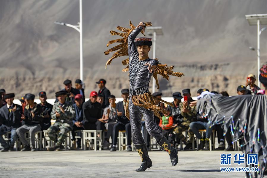 在熱斯喀木村,新疆塔什庫爾干塔吉克自治縣文工團(tuán)演員為村民表演國家級非物質(zhì)文化遺產(chǎn)——塔吉克族鷹舞(6月6日攝)。新華社記者胡虎虎攝