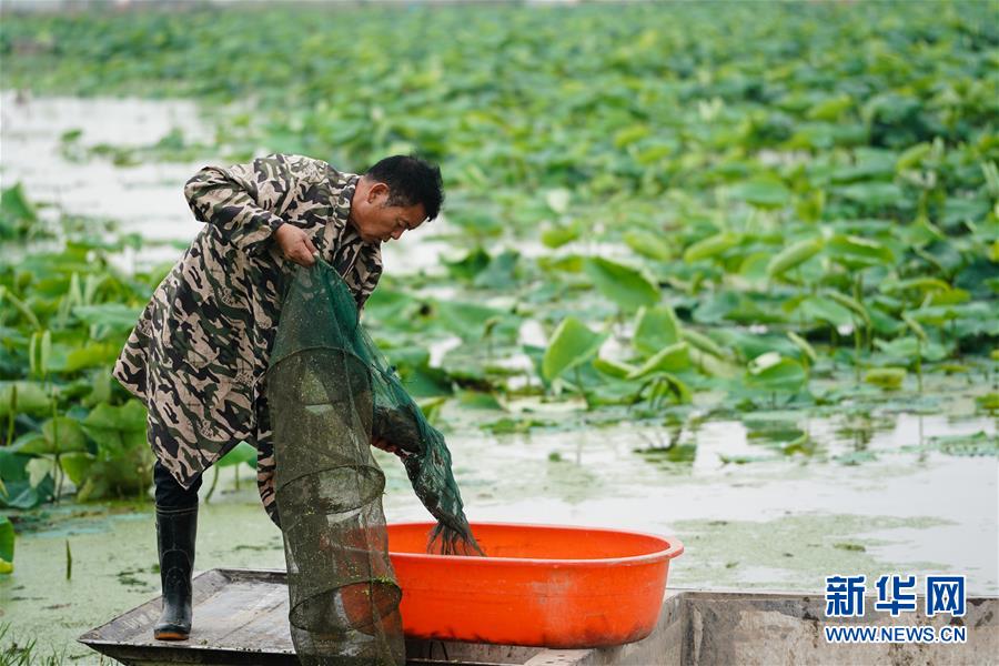 6月9日,在宿遷市宿城區(qū)中揚(yáng)鎮(zhèn)一家淺水藕套養(yǎng)小龍蝦合作社,負(fù)責(zé)人王乃國在取蝦苗(無人機(jī)照片)。新華社記者季春鵬攝