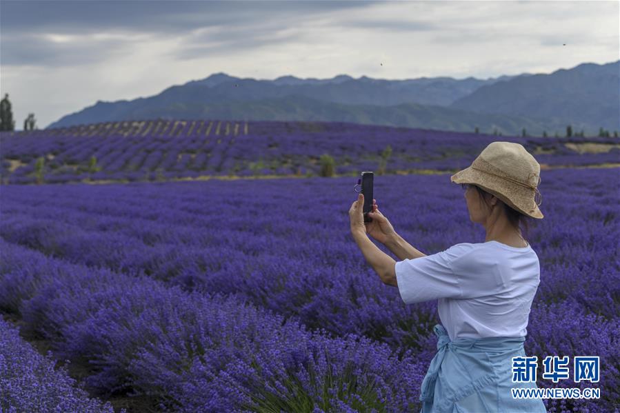 游客在霍城縣蘆草溝鎮(zhèn)四宮村的一處薰衣草花田里拍照留念(6月16日攝)。新華社記者 趙戈 攝