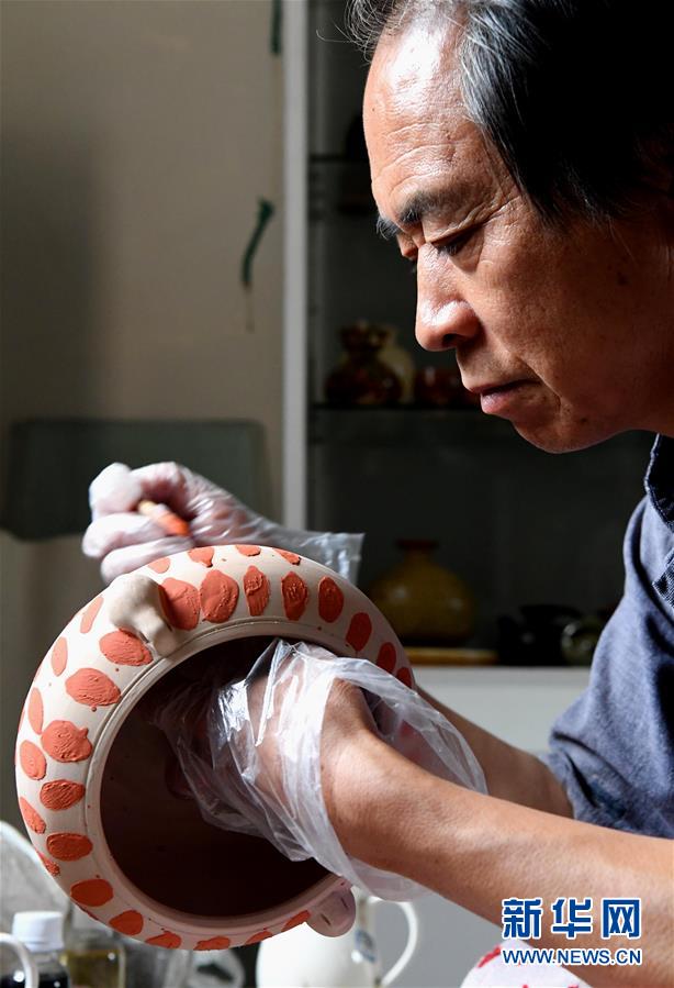 在河南省鞏義市站街鎮(zhèn)小黃冶村的工作室里,游光明運(yùn)用點(diǎn)彩手法施釉(6月19日攝)。新華社記者李安攝