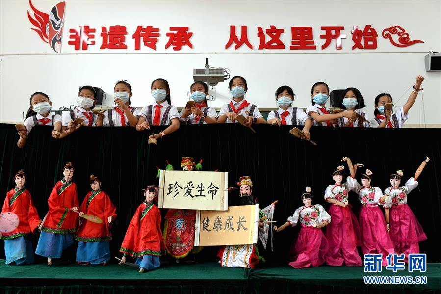 6月22日,連城縣實(shí)驗(yàn)小學(xué)學(xué)生展演連城提線(xiàn)木偶戲,開(kāi)展禁毒宣傳活動(dòng)。在“6·26”國(guó)際禁毒日來(lái)臨之際,福建省連城縣城鄉(xiāng)小學(xué)學(xué)生將提線(xiàn)木偶、雕版印刷及傳統(tǒng)花燈等當(dāng)?shù)乜图曳沁z文化元素,融入校園禁毒宣傳活動(dòng)中,提高防毒、拒毒和禁毒意識(shí)。新華社記者彭張青攝
