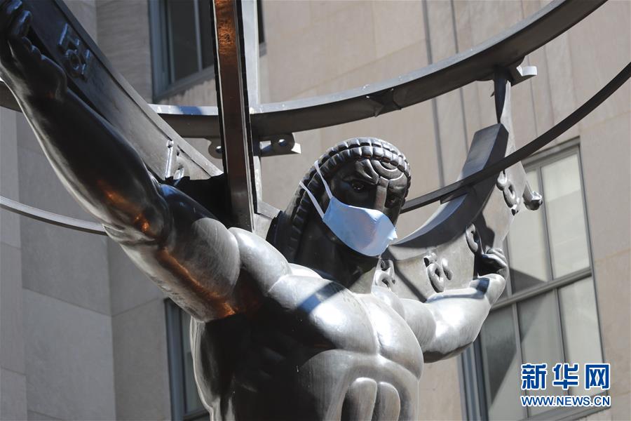 6月22日,在美國(guó)紐約洛克菲勒中心,一座雕像被“戴”上口罩。美國(guó)約翰斯·霍普金斯大學(xué)22日發(fā)布的新冠疫情最新統(tǒng)計(jì)數(shù)據(jù)顯示,美國(guó)累計(jì)死亡病例超過12萬例。新華社記者王迎攝